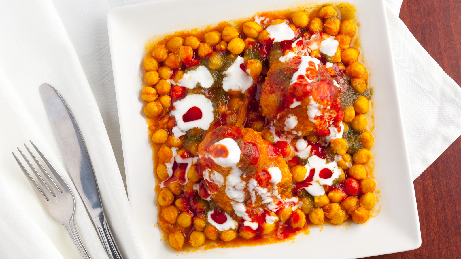 Vegetarian. Lightly spiced Indian turnovers, stuffed potatoes, and peas.